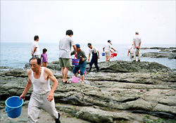 中間育成施設で飼育した子供たちを海に放流します。今度は自分の力で餌を探して食べ大きくなります。